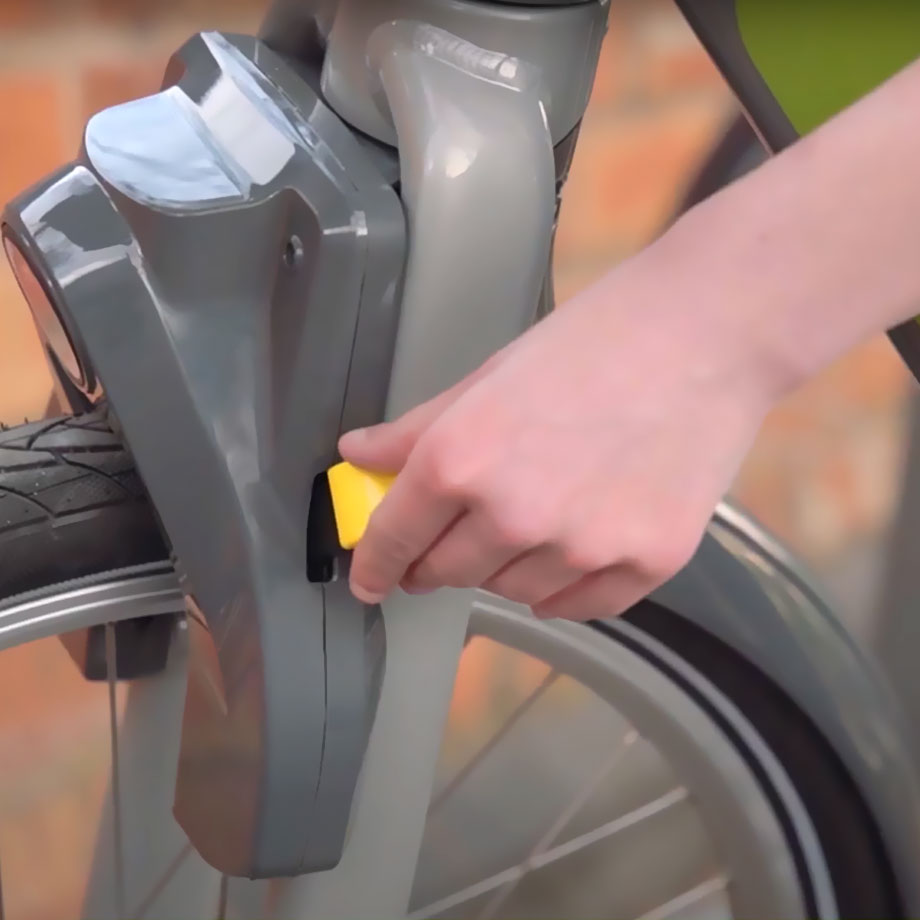 When the rider has arrived at their destination docking station, they simply park the bike in a dock and push the fork lever to secure the lock. If there are no free docks available, the lock can still be activated when the bike is parked safely alongside the docking station.