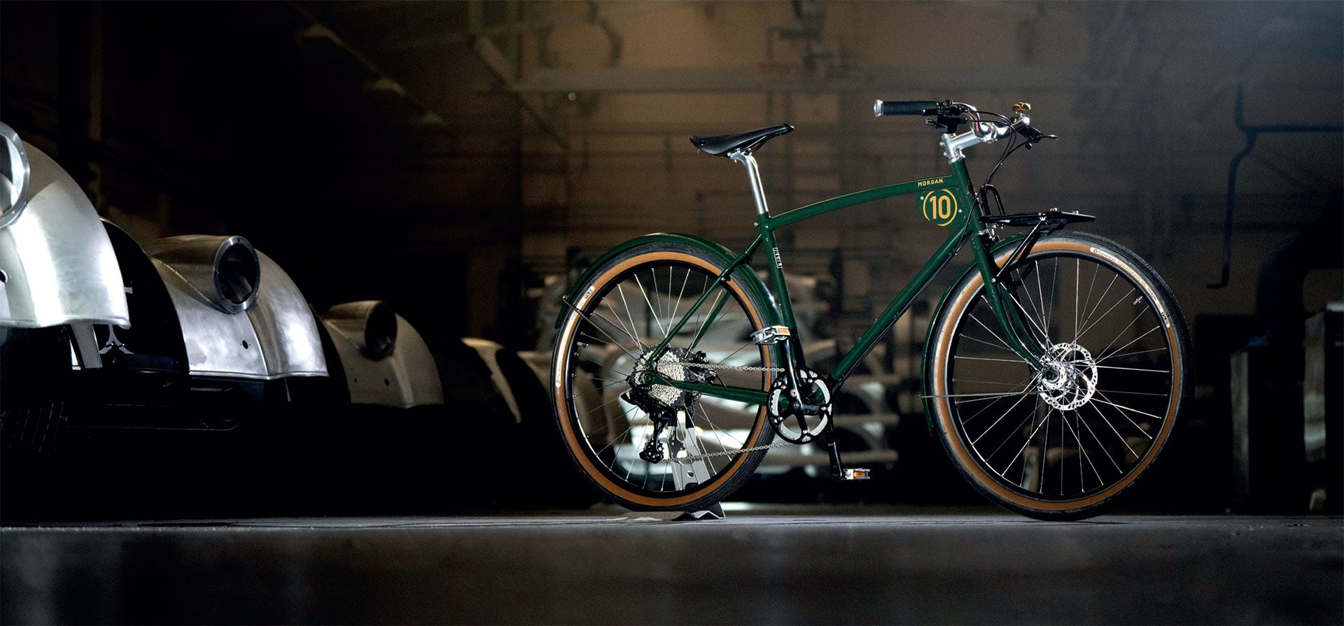The frame mounted race plate draws inspiration from Morgan’s racing heritage while proudly displaying the distinctive yellow ‘10’ roundel. The 10 is built with practicality in mind. It features full length colour matched aluminium mudguards with sturdy stainless steel stays and hardware to fend off the worst of the British weather. A prop stand adds convenience, and the unique front rack adds carrying capacity.