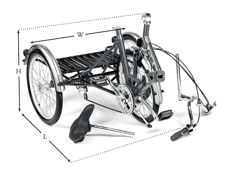 The hinged frame allows the trike to be folded quickly and reduce its length when storage space is at a premium. The frame also includes quick release fittings on the handlebar stem and seatpost to allow easy lowering, positioning, or removal of the handlebars and saddle to achieve the most compact package. A propstand is provided to keep the trike upright when folded.